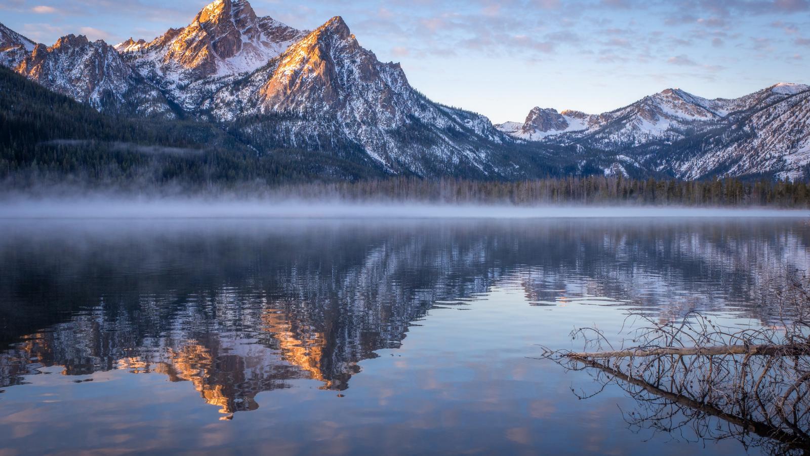 Wallpaper Fog over a cold lake with mountains in the background