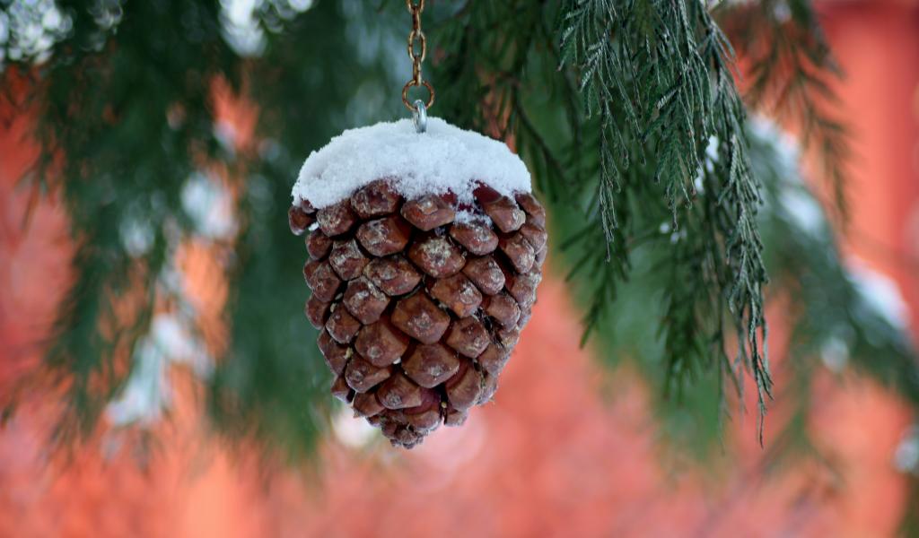 Wallpaper A pine cone on a chain hangs on a thuja branch