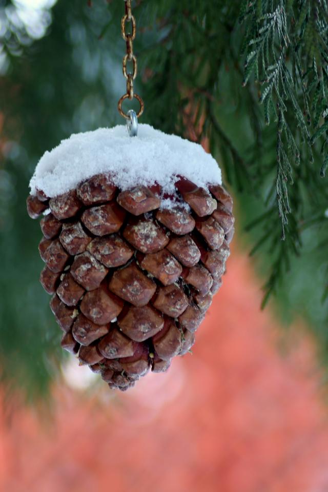 Wallpaper A pine cone on a chain hangs on a thuja branch