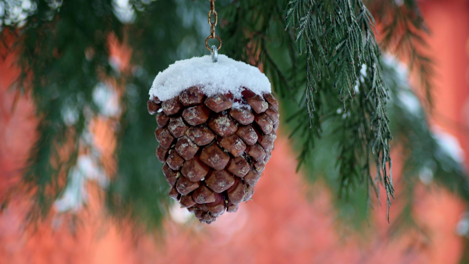 Wallpaper A pine cone on a chain hangs on a thuja branch