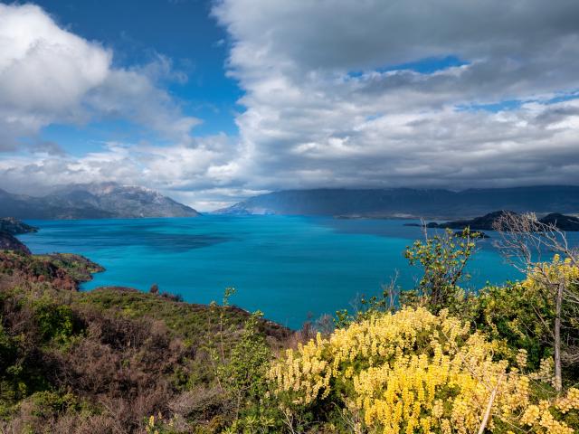 Wallpaper Thick white clouds over a lake in the mountains