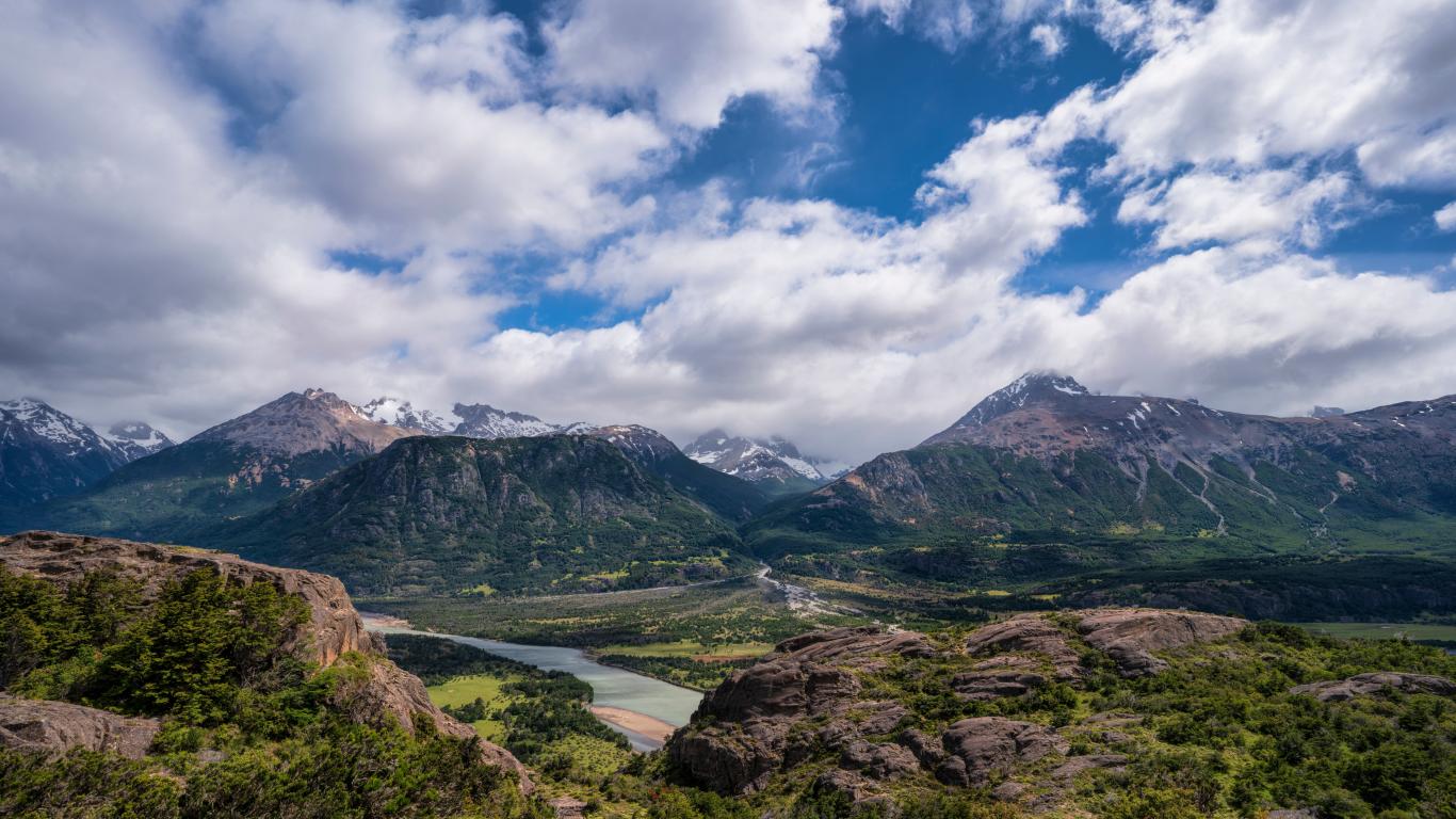Wallpaper White clouds in blue sky over green-covered mountains