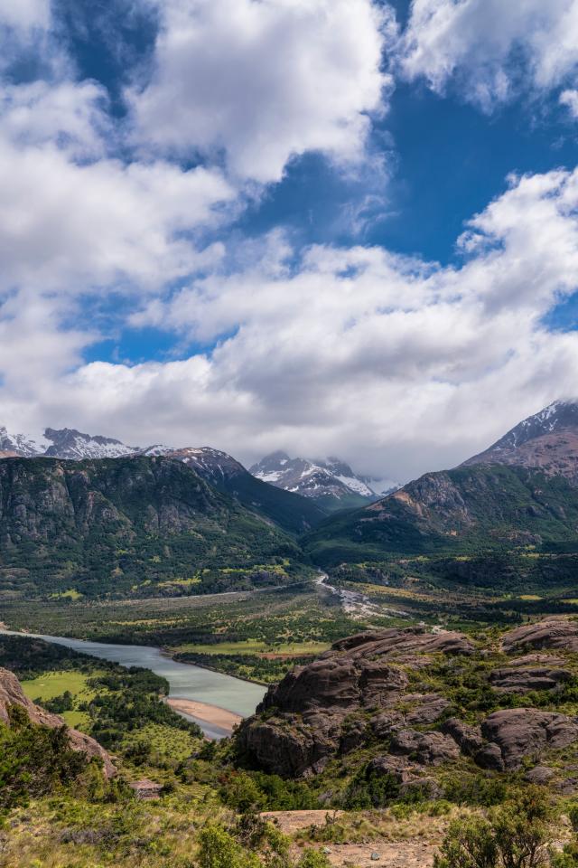 Wallpaper White clouds in blue sky over green-covered mountains