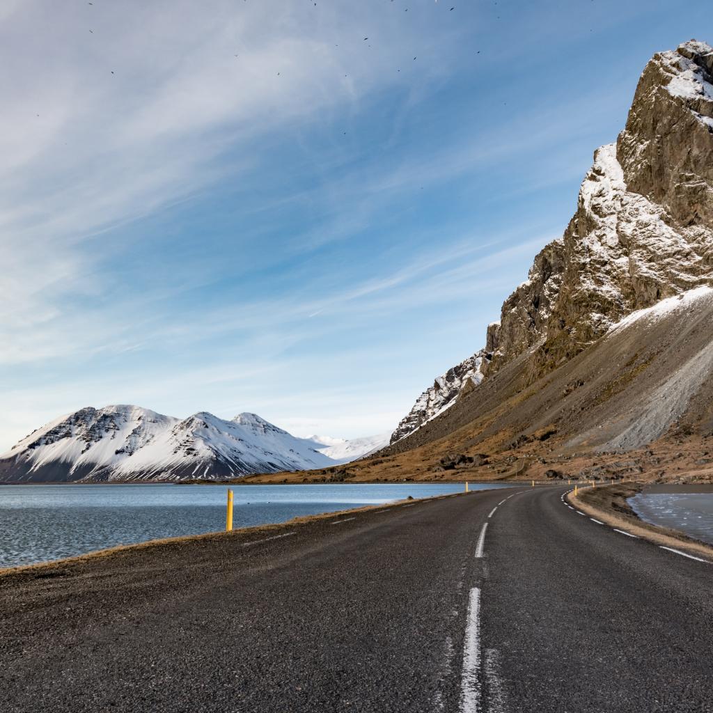 Wallpaper Asphalt road leads to the mountains under the blue sky