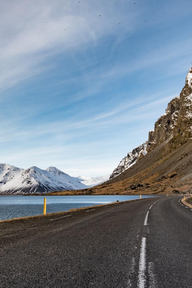 Wallpaper Asphalt road leads to the mountains under the blue sky