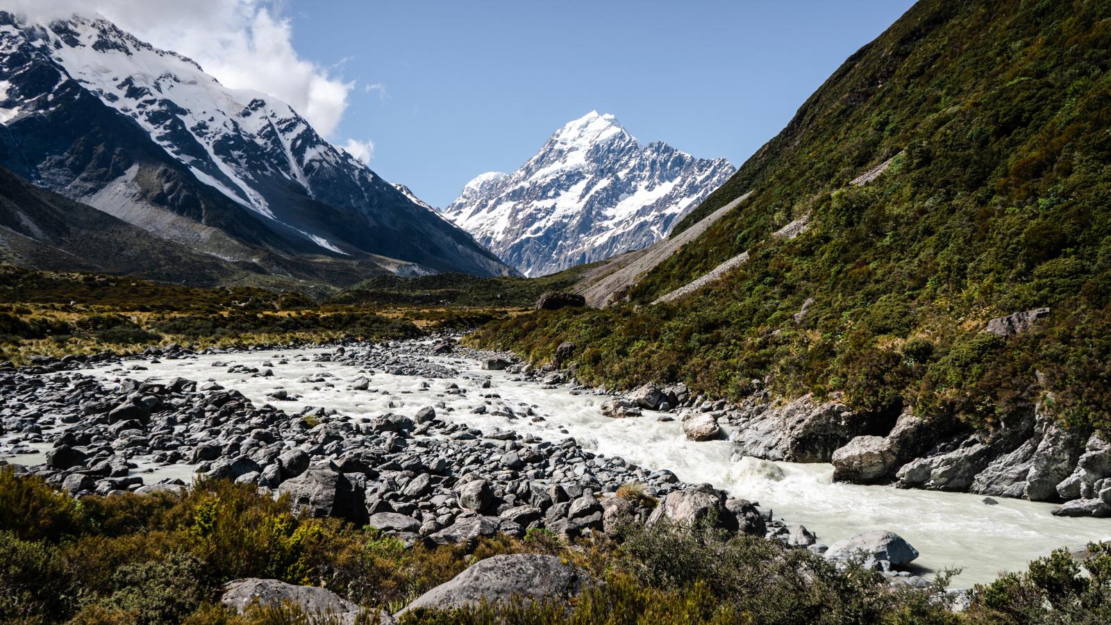 Wallpaper Frozen river against the backdrop of snow-capped mountains