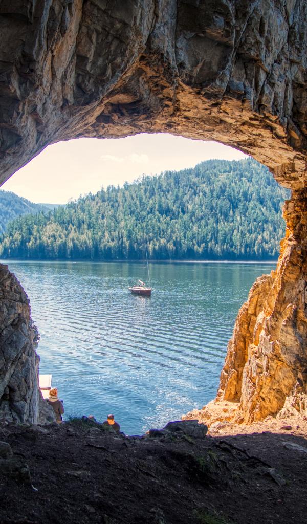 Wallpaper An archway in the rock leads to the lake