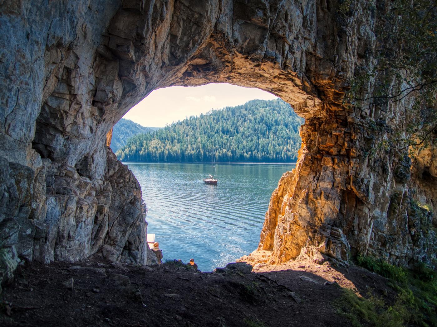 Wallpaper An archway in the rock leads to the lake