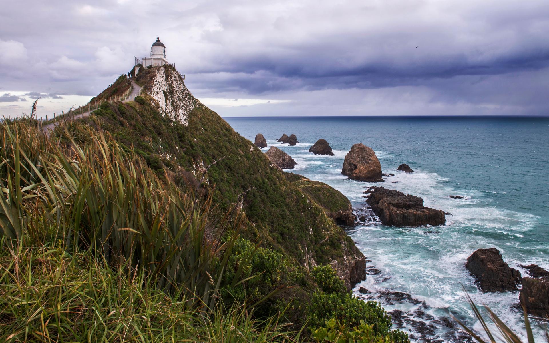 Wallpaper Lighthouse on a cliff top by the sea under a stormy sky