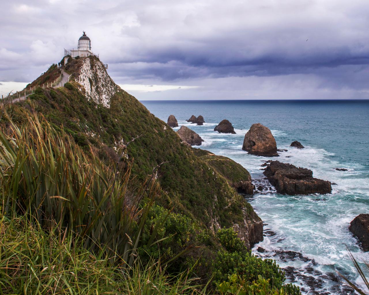 Wallpaper Lighthouse on a cliff top by the sea under a stormy sky