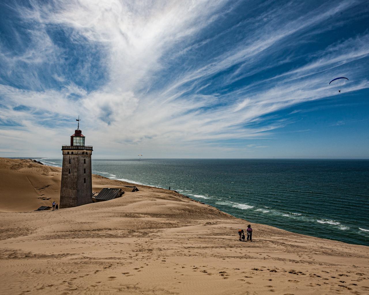 Wallpaper Lighthouse on the sand by the sea under the blue sky
