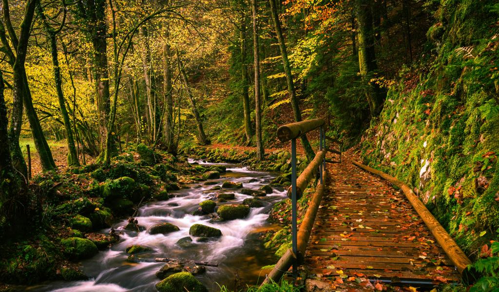 Wallpaper Wooden bridge by the stream in the autumn forest
