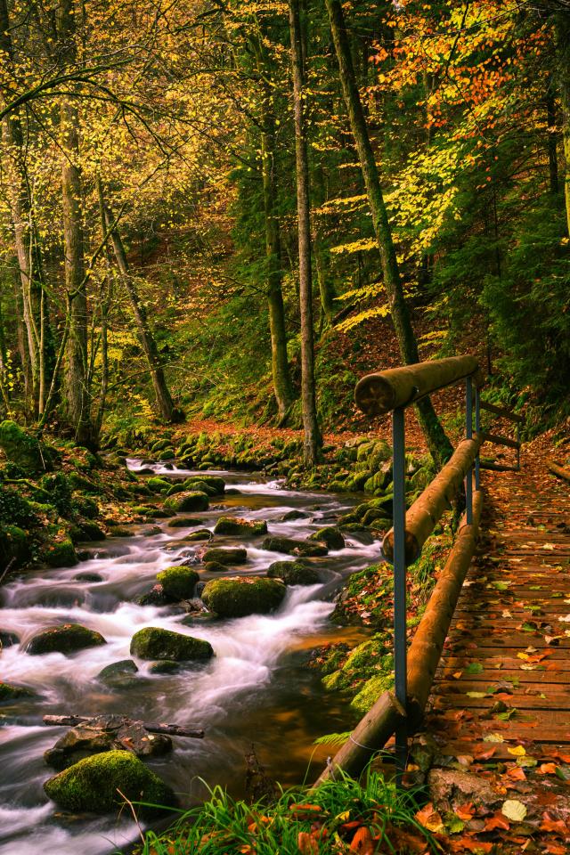 Wallpaper Wooden bridge by the stream in the autumn forest