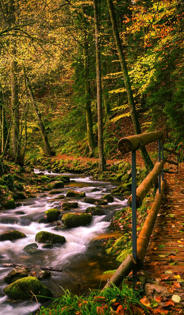 Wallpaper Wooden bridge by the stream in the autumn forest