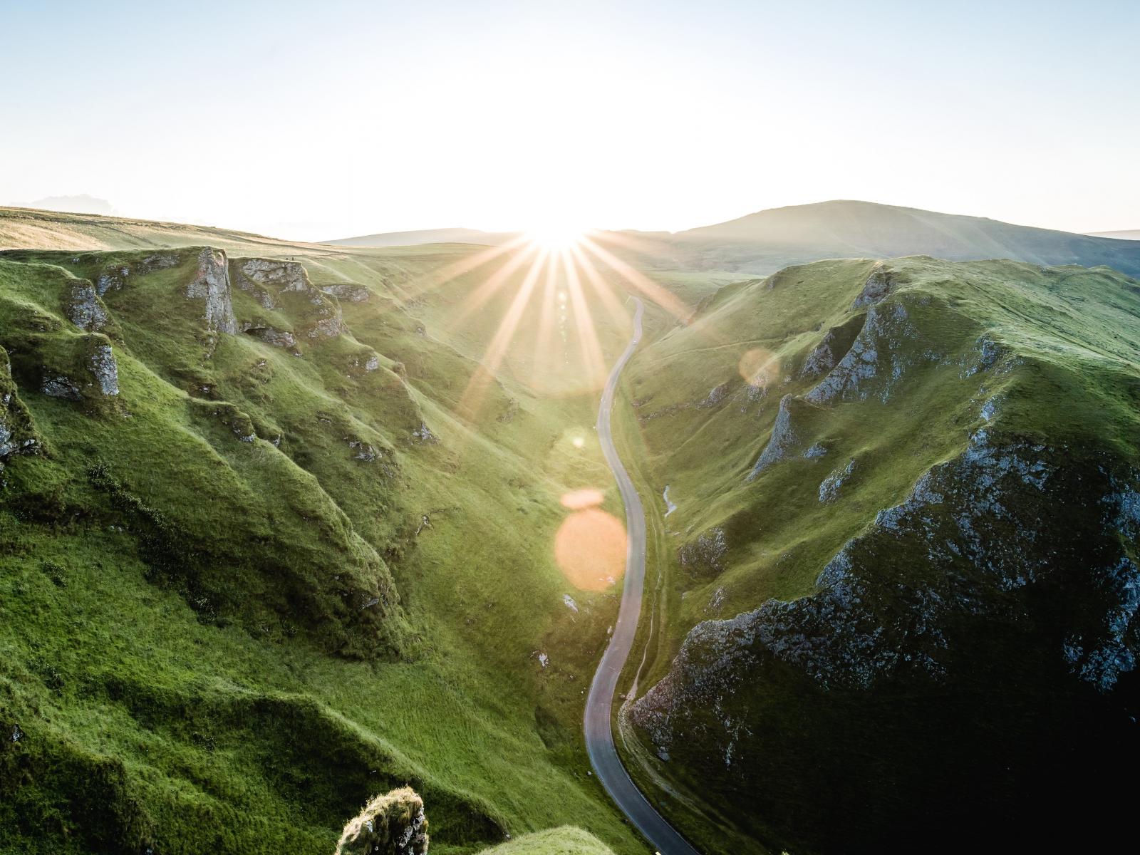 Wallpaper The road between the lush mountains in the sun