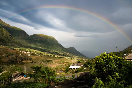 Wallpaper Large multicolored rainbow in the sky over the mountains