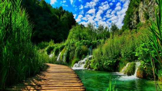 Wallpaper Wooden bridge in a picturesque green forest with waterfalls