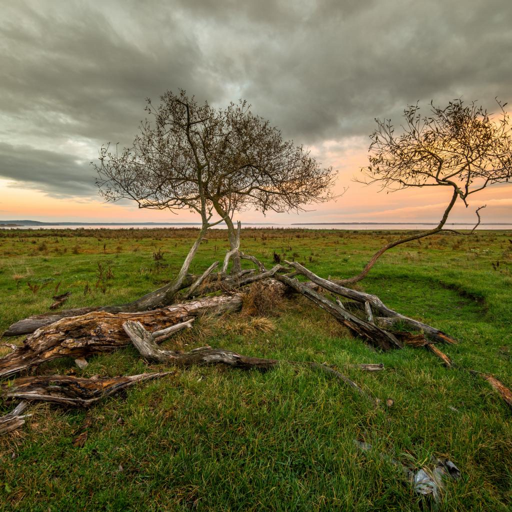 Wallpaper Dry trees in a green meadow under a beautiful sky