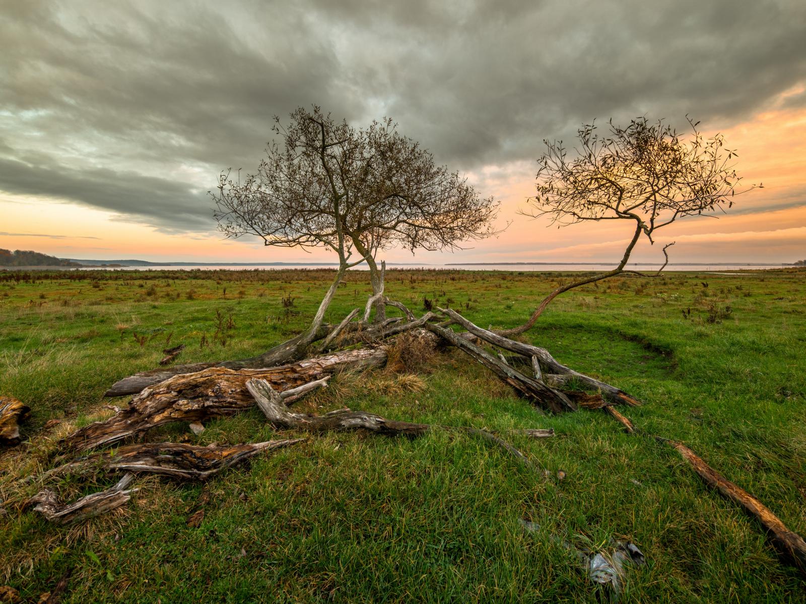 Wallpaper Dry trees in a green meadow under a beautiful sky
