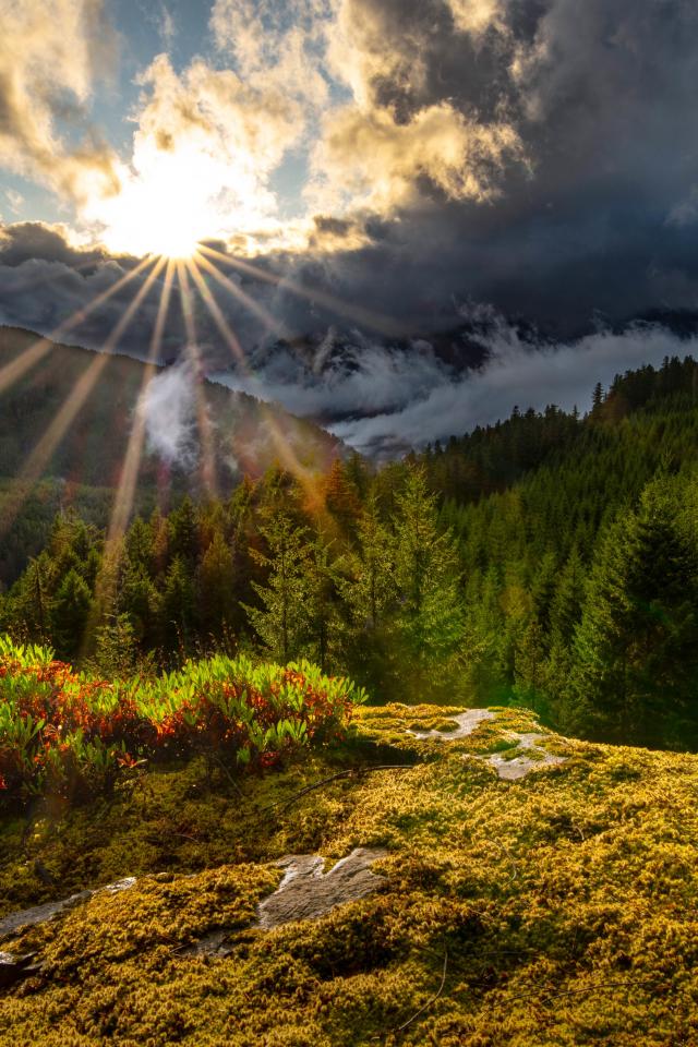Wallpaper Bright sun in dark clouds over the forest in the mountains