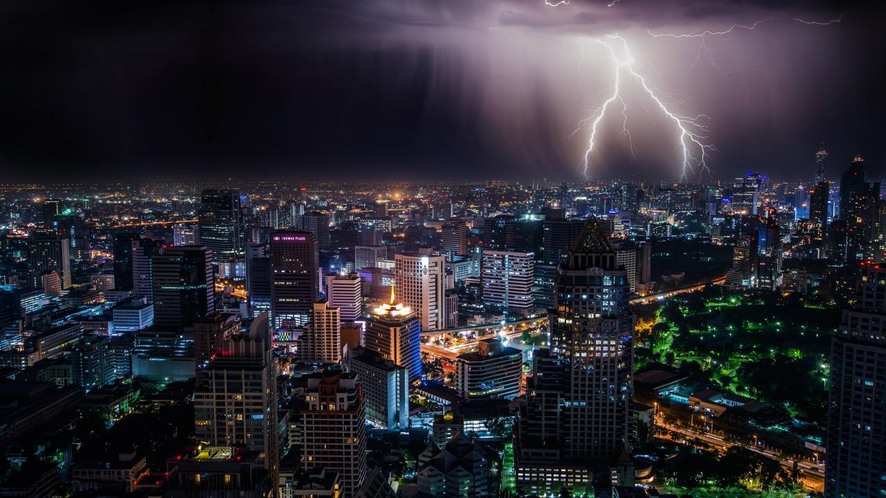 Wallpaper Lightning in the stormy sky over the night metropolis