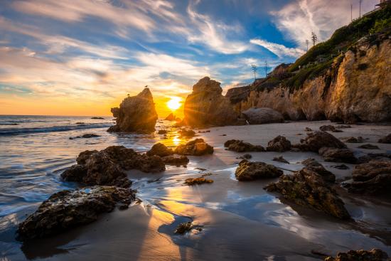 Wallpaper Summer sun bright dawn over rocks and ocean