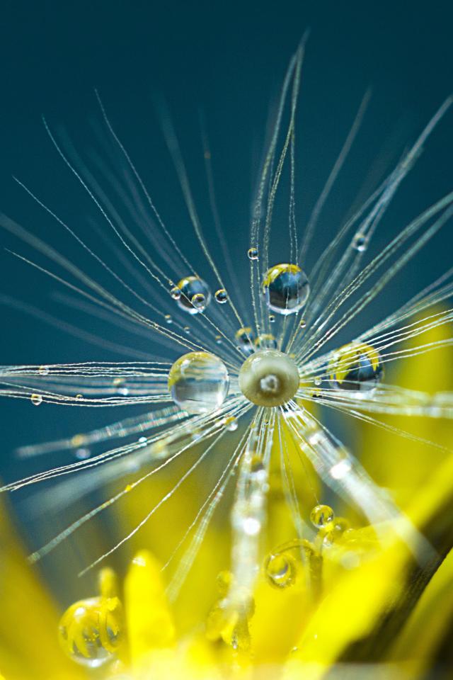 Wallpaper White dandelion seeds in dew drops close up