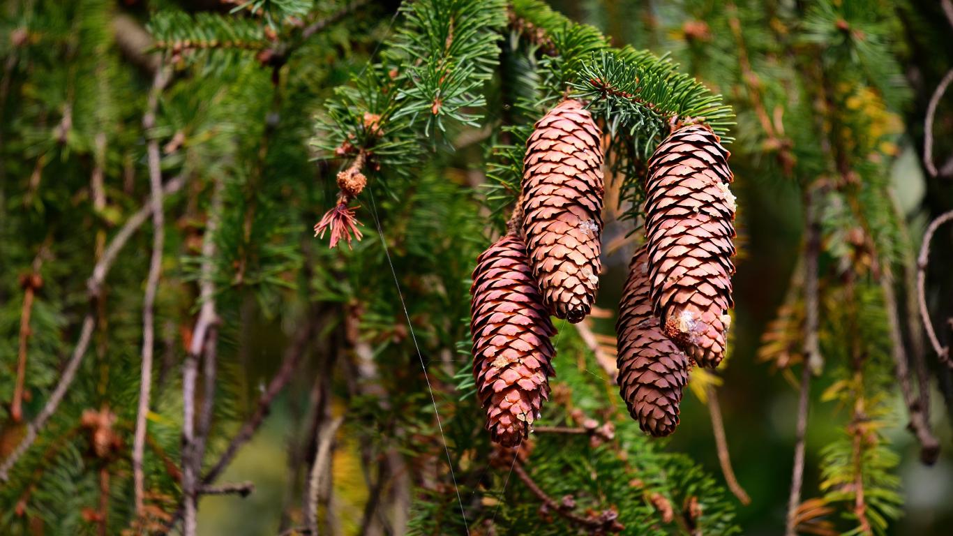 Wallpaper Big brown cones on a thorny branch of a spruce