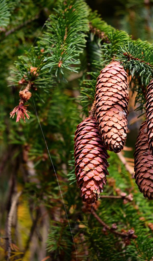 Wallpaper Big brown cones on a thorny branch of a spruce