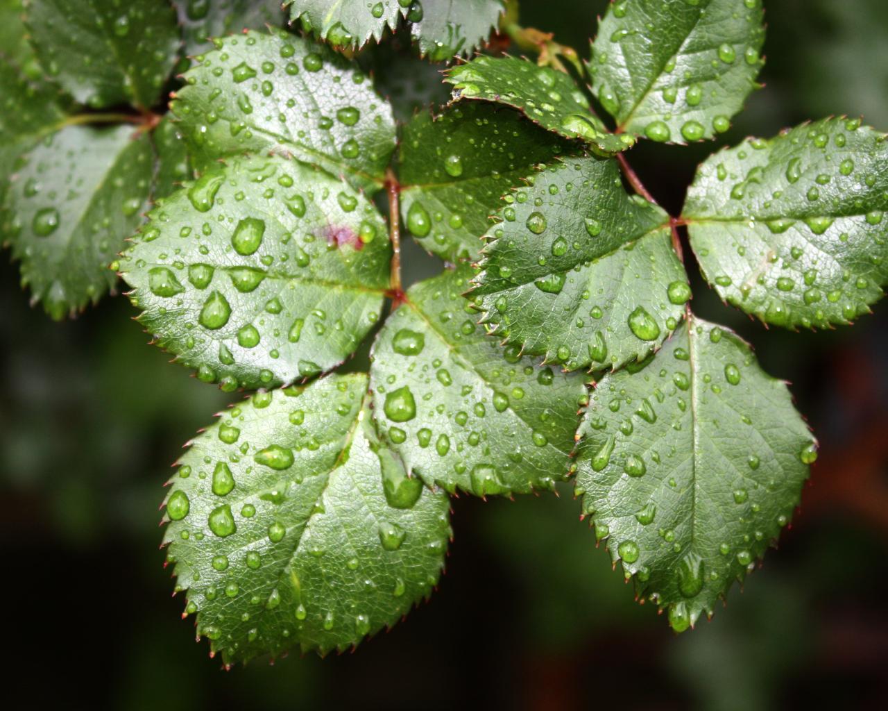 » Wallpaper Green rose leaves in drops of water