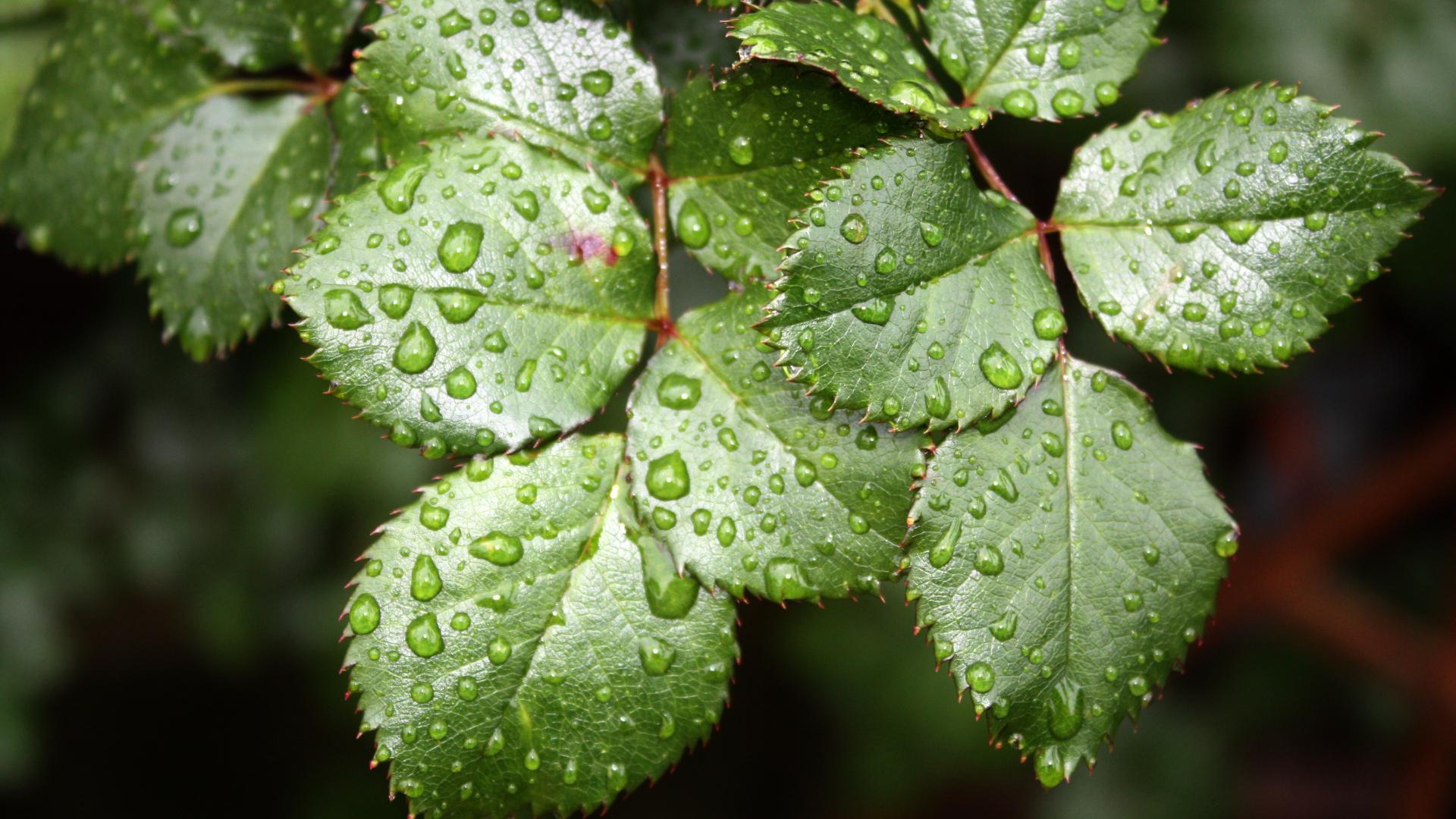 Wallpaper Green rose leaves in drops of water