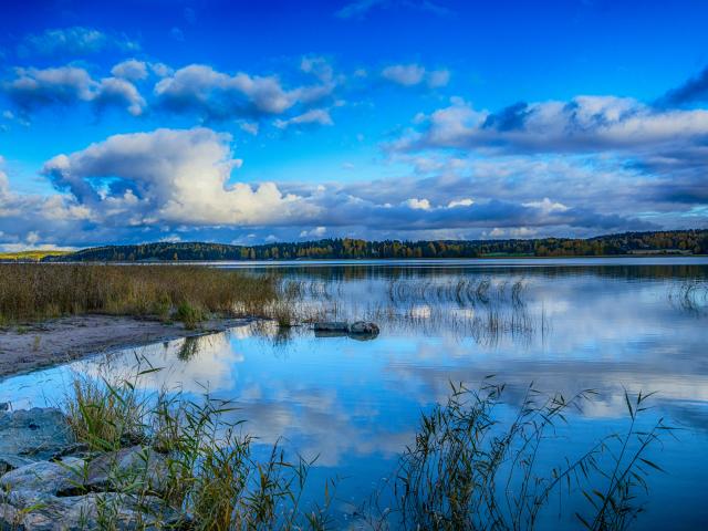 Wallpaper Blue sky with clouds reflected in the lake