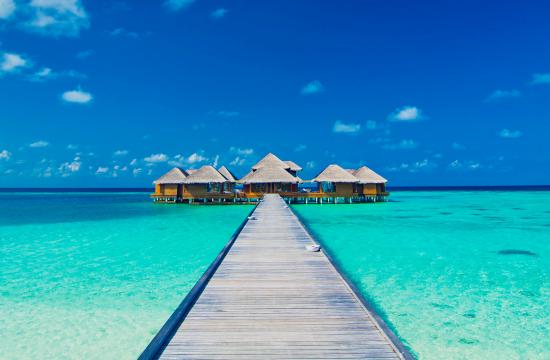 Wallpaper Wooden bridge to stilt houses in the blue ocean