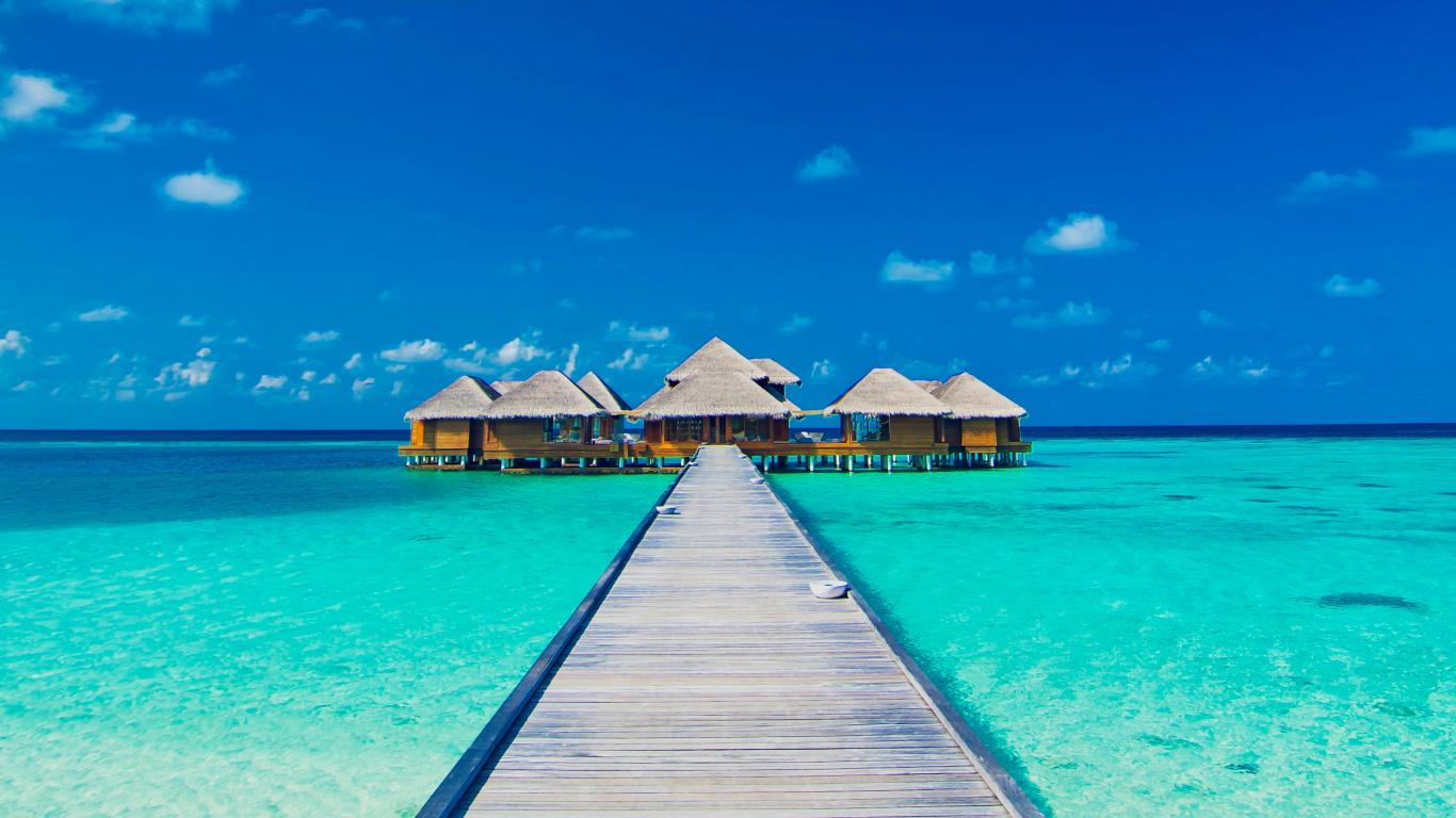Wallpaper Wooden bridge to stilt houses in the blue ocean