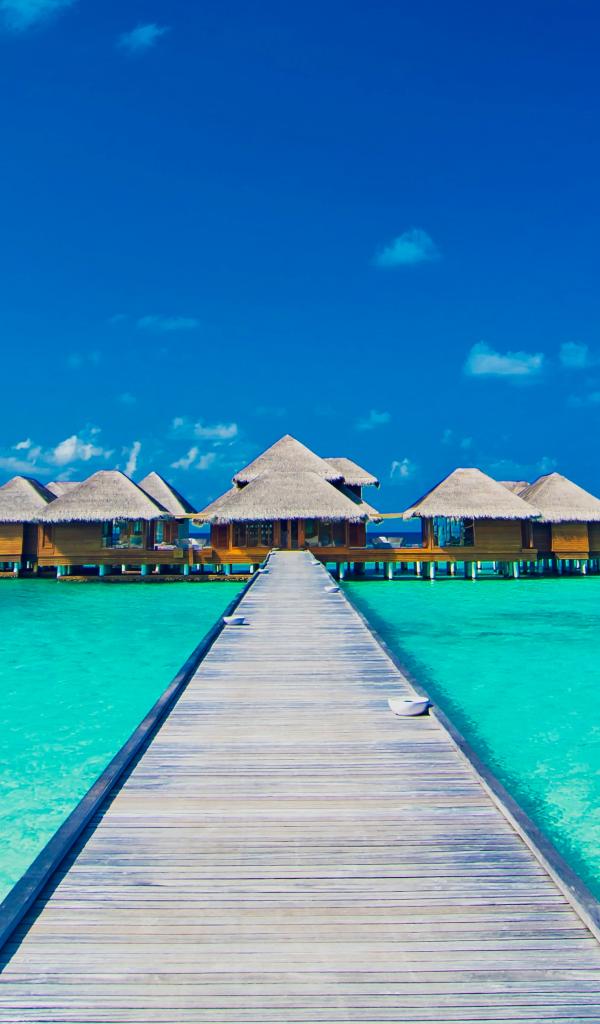 Wallpaper Wooden bridge to stilt houses in the blue ocean