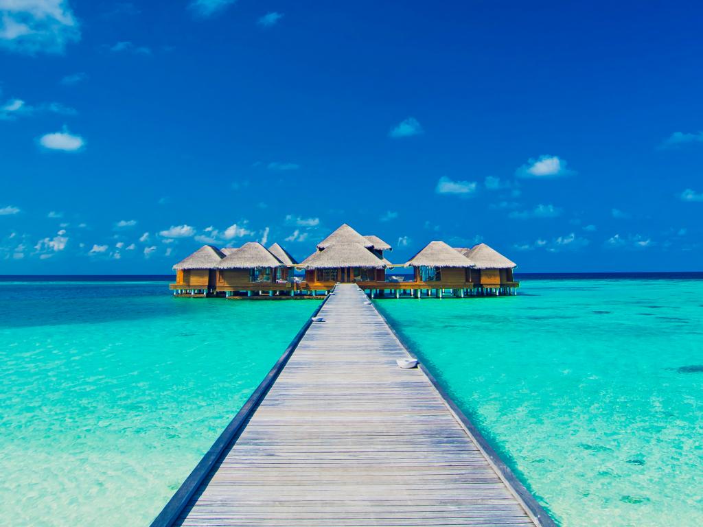 Wallpaper Wooden bridge to stilt houses in the blue ocean