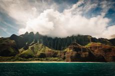 Wallpaper View of a beautiful blue lake and mountain valley under a sunny sky with white clouds