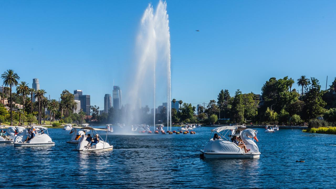 Wallpaper Beautiful lake with a fountain and catamarans
