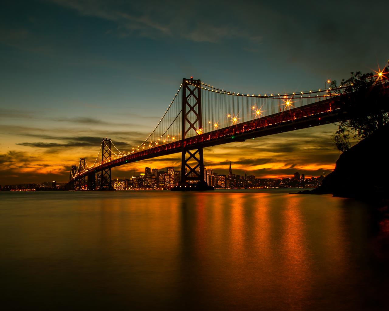 Wallpaper Bridge with lanterns at night over the river