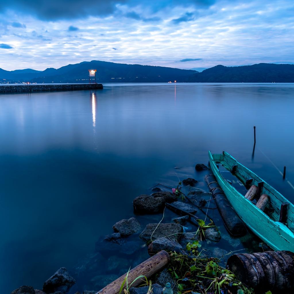 Wallpaper Wooden boat on a quiet lake at dusk