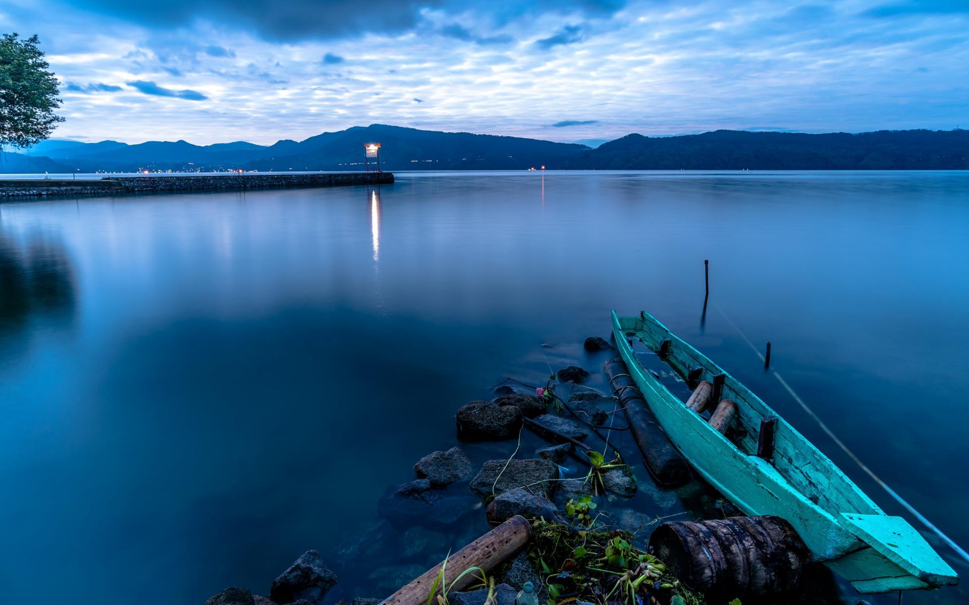 Wallpaper Wooden boat on a quiet lake at dusk