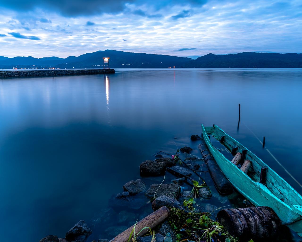 Wallpaper Wooden boat on a quiet lake at dusk