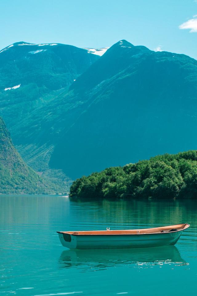Wallpaper Boat in the water of a lake in the mountains