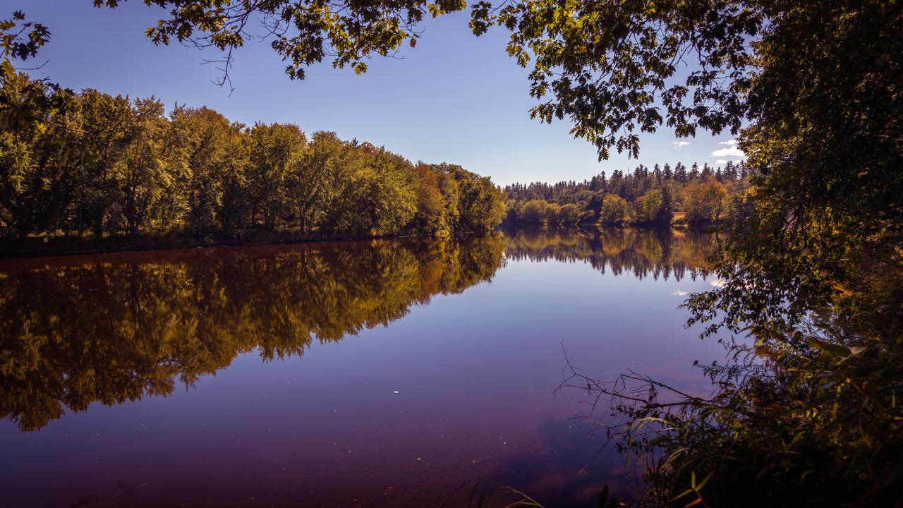 Wallpaper Dawn over the still water of a river in a forest