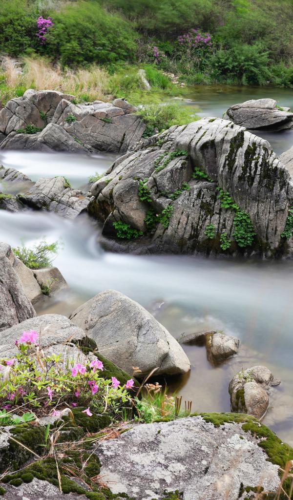 Wallpaper Mountain stream flows down the stones into the river