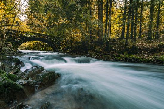 Wallpaper Rapid river water in the forest under the old bridge