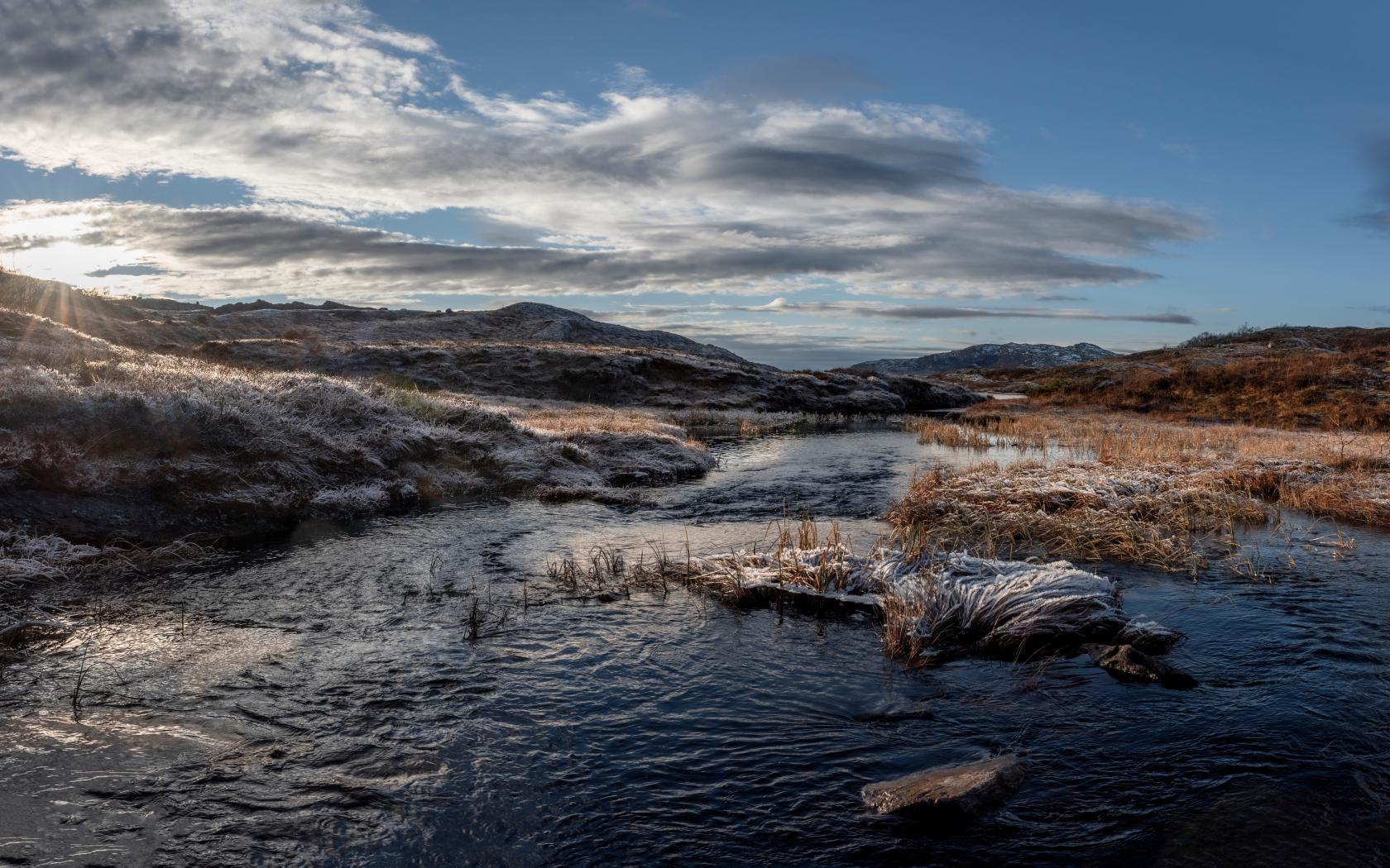 Wallpaper Frosty grass on the river bank in the sunshine