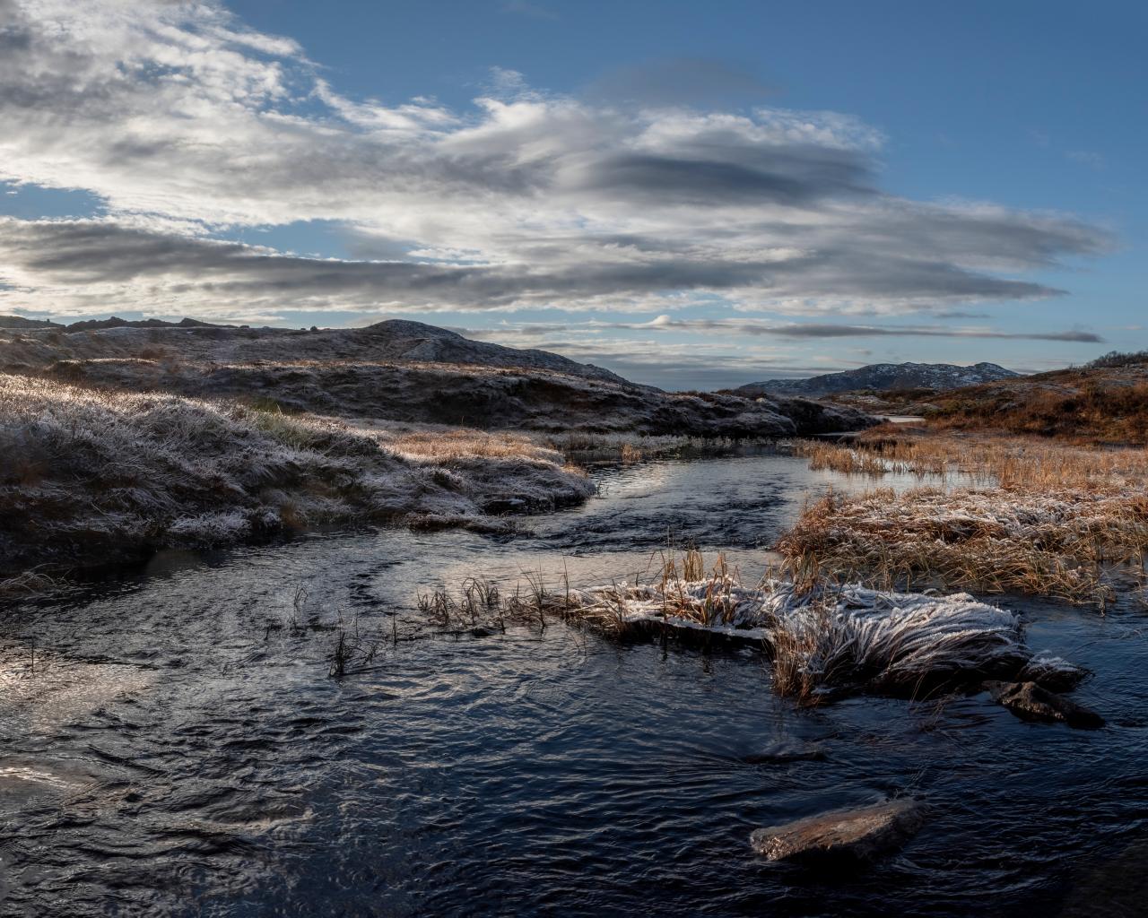 Wallpaper Frosty grass on the river bank in the sunshine