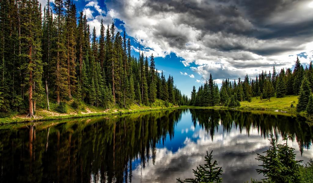 Wallpaper Tall pine trees on the lake under dark storm clouds