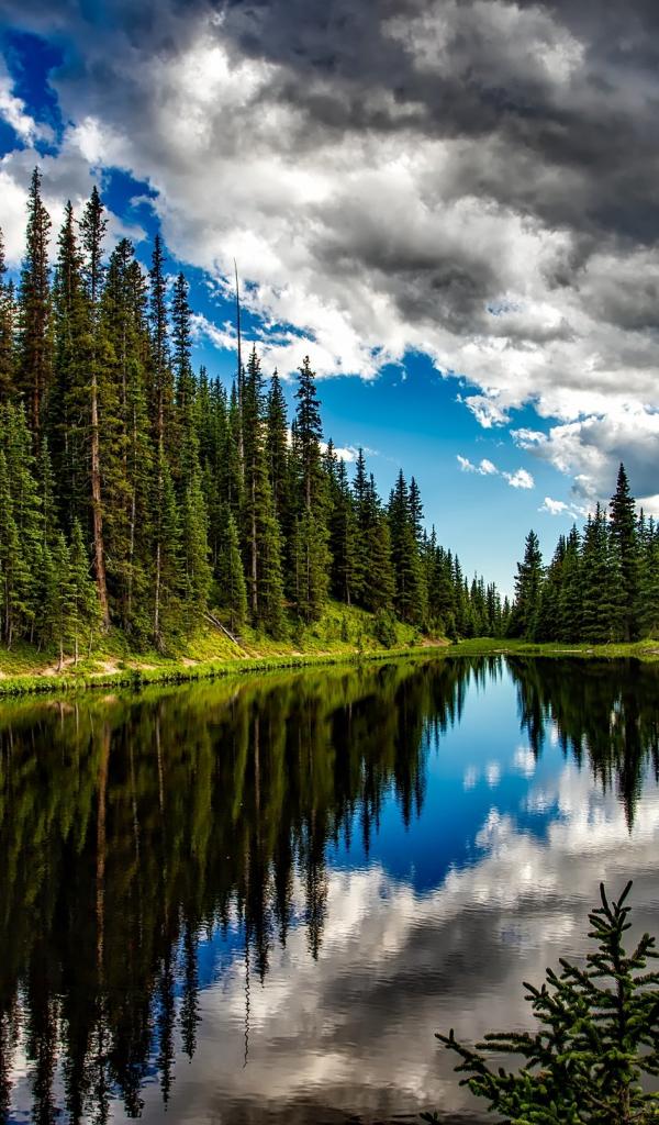 Wallpaper Tall pine trees on the lake under dark storm clouds